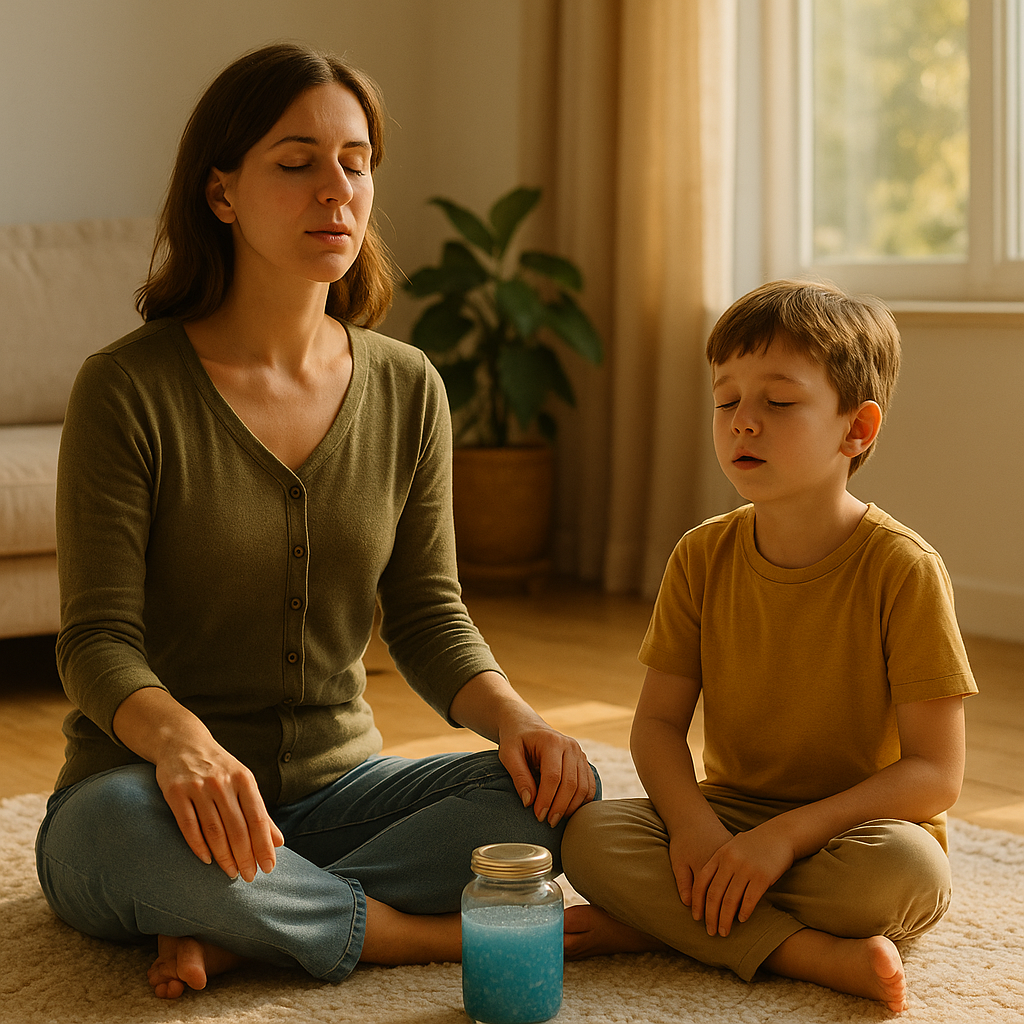 1-Caja de la calma: Botella sensorial, pelota antiestrés, tarjetas de respiración, cuentos cortos.